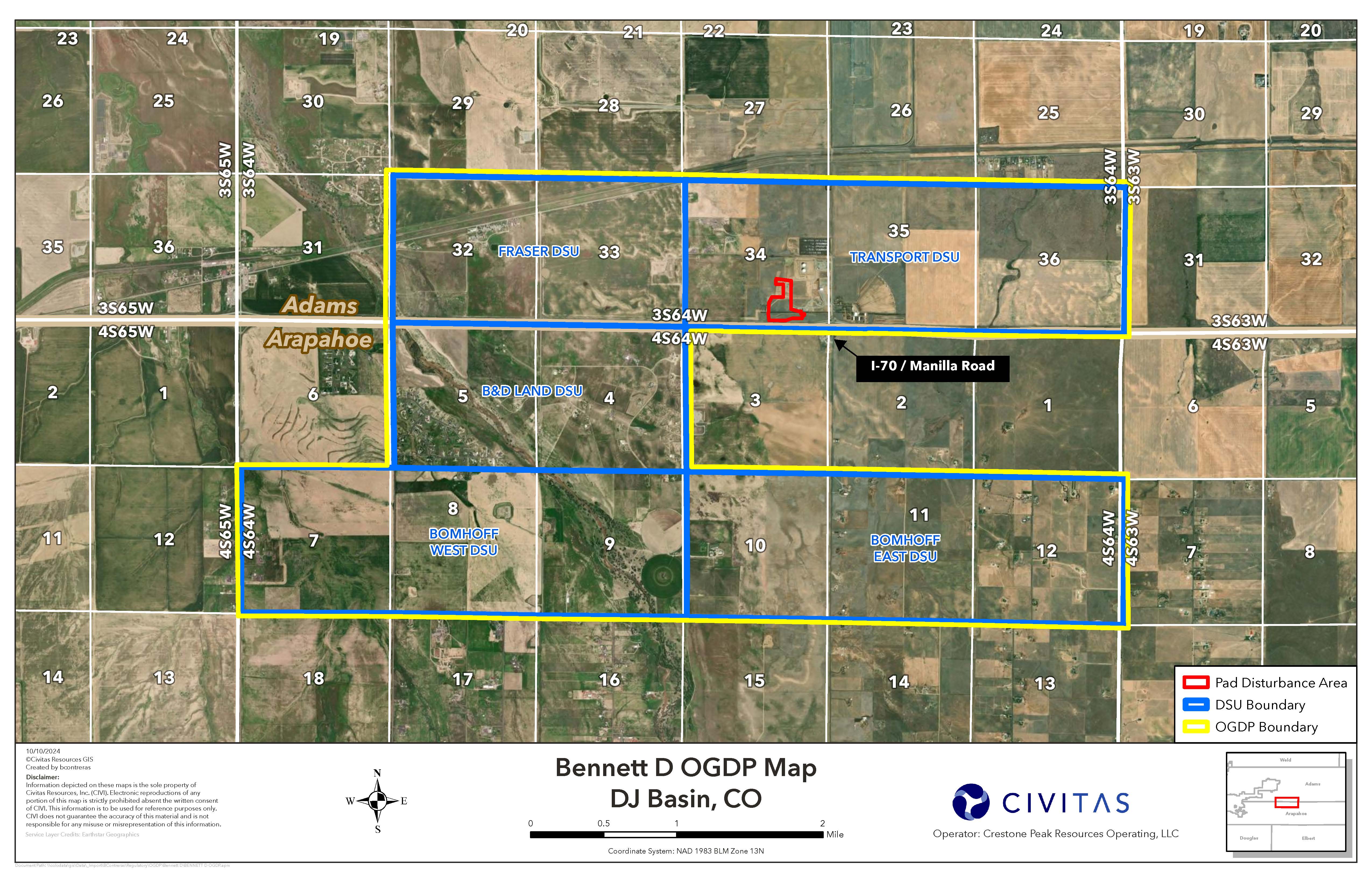 The Bennett D Pad is located in near the intersection of Manilla Road and Interstate 70 in Adams County, and is collocated with existing infrastructure. The proposed pad will occupy approximately 23 acres during pre-production (drilling and completions), scaling down to approximately seven and a half acres during production. The plan proposes five drilling spacing units and will include up to 26 new horizontal wells.